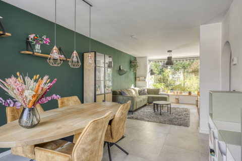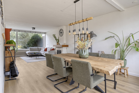 Tussen het zitgedeelte en de keuken ligt een royale open ruimte die je helemaal naar eigen wens kunt inrichten. Hier past met gemak een grote eettafel waar je uitgebreid kunt dineren met familie en vrienden. Maar je kunt er ook een gezellige speelhoek maken voor de kinderen, zodat ze dichtbij zijn terwijl jij kookt of aan tafel zit. Deze centrale plek in huis nodigt uit tot samenzijn, of je nu met z’n allen aan het ontbijten bent of een spelletje doet op een regenachtige zondagmiddag.
