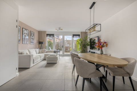 Vanuit de hal kom je in de riante leefruimte van ruim 53 m² – een open indeling met volop mogelijkheden voor jouw gezin. Aan de voorzijde creëer je eenvoudig een royale zithoek, waar je met het hele gezin films kijkt of gasten ontvangt. De erker zorgt voor extra licht en een vrij uitzicht zonder inkijk. De strakke wand- en plafondafwerking, gecombineerd met de luxe pvc-vloer met vloerverwarming als hoofdverwarming, zorgen voor een warme, moderne sfeer.